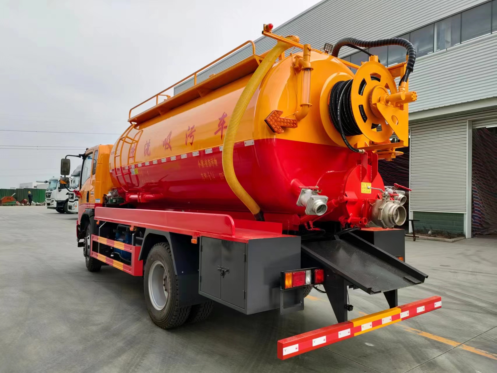 該車專用裝置主要由清水罐和污水罐組成,用于下水道排污及疏通,罐體帶有舉升功能。清水罐和污水罐為兩個**罐體,清洗功能時用清水罐,吸污功能時用污水罐,清洗、吸污兩種功能不能同時使用,兩個罐體不能同時滿載;罐體外形尺寸(直段長×直徑)(mm):4900×1750,其中罐體前段1650mm為清水罐,罐體后段3250mm為污水罐;清水罐罐體總?cè)萘?.9立方米,有效容積3.8立方米;污水罐罐體總?cè)萘?.8立方米,有效容積7.5立方米。側(cè)/后防護材料為Q235,側(cè)防護采用螺栓連接,后防護采用焊接連接,截面尺寸(mm):120×60,離地高(mm):470。ABS系統(tǒng)**器型號/生產(chǎn)企業(yè)對應(yīng)關(guān)系為:CM3XL-4S/3M(4SF)/廣州瑞立科密汽車電子股份有限公司;XH-KQ4S3M-E01/廣州市西合汽車電子裝備有限公司。僅采用3900mm軸距,整車長/后伸對應(yīng)關(guān)系(mm):7850/175,7675/0.隨底盤選裝駕駛室。選裝后部卸污口,后蓋樣式,側(cè)面油缸樣式。后部箭頭燈和照明燈僅在車輛作業(yè)時使用,車輛行駛中不工作。 | |||